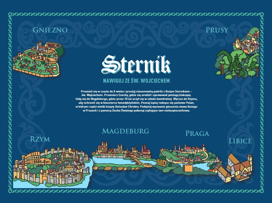 Przemierz Czechy, gdzie się urodził i sprawował posługę biskupią. Udaj się do Magdeburga, gdzie przez 10 lat uczył się w szkole katedralnej. Wyrusz do Rzymu, aby schronić się w klasztorze benedyktyńskim. Poznaj lepiej rodzące się państwo Polan, w którym rządzi wielki książę Bolesław Chrobry. Podejmij wyzwanie głoszenia słowa Bożego w Prusach i z pomocą Ducha Świętego pokonaj czyhające tam niebezpieczeństwa.